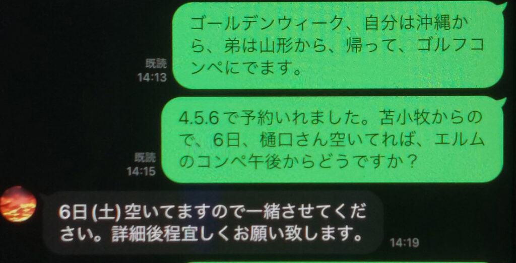 PS.5月の弟との対決で4日連続、オープンコンペに参加します。初日以外2組づつゴルフ場を取って、取り合えず北海道のゴルフ友達、20人ぐらいに声をかけました、即、皆から、返答があって、家族とゴールデンウィーク過ごす方、別のコンペが入ってる方、行きたいけど、まだ休みが決まって無い方、調整中な方ですが。結構すぐにオッケーが出て後、数人しか枠が無いので・・・取り合えず、今回はオーバーしないように、ここで一旦ストップです。せっかくだから、天気が良くて、コンペなので、何か賞に入りたいな?毎回、一応優勝を狙ってますけど・・・