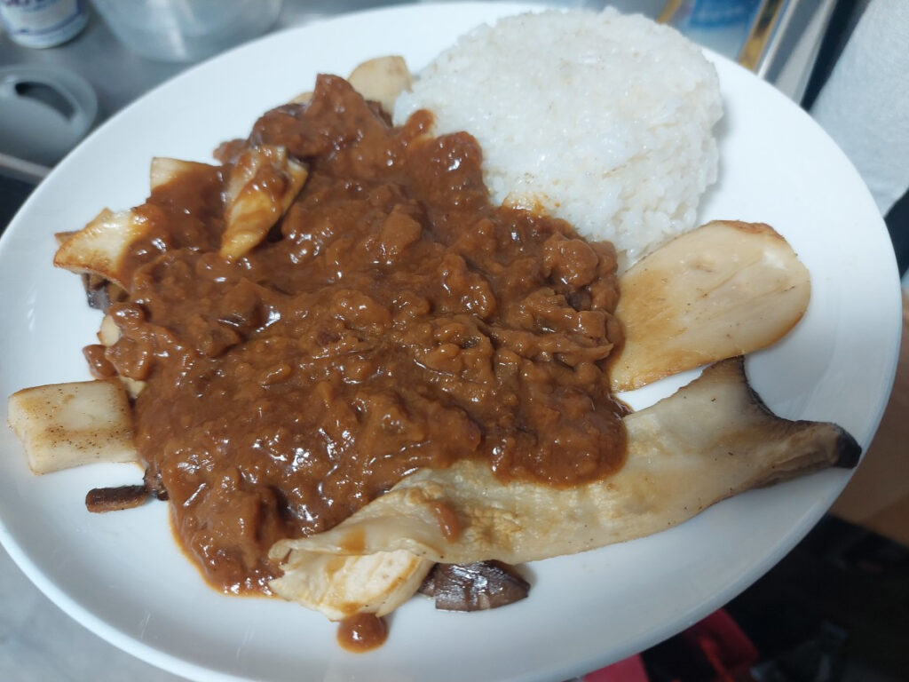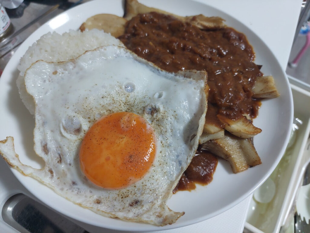 で・・・朝は、最近気に入ってる、大ぶりのエリンギをバターで炒めて、ご飯を温めて、レトルトカレーをかけて、目玉焼きをのせて完成。アイスチョコバーを食いながら、ブログを更新してます。お腹が一杯になったのと、寝てないので、眠くなってきました。ホームページのブログとFacebookを更新したら寝よう・・・