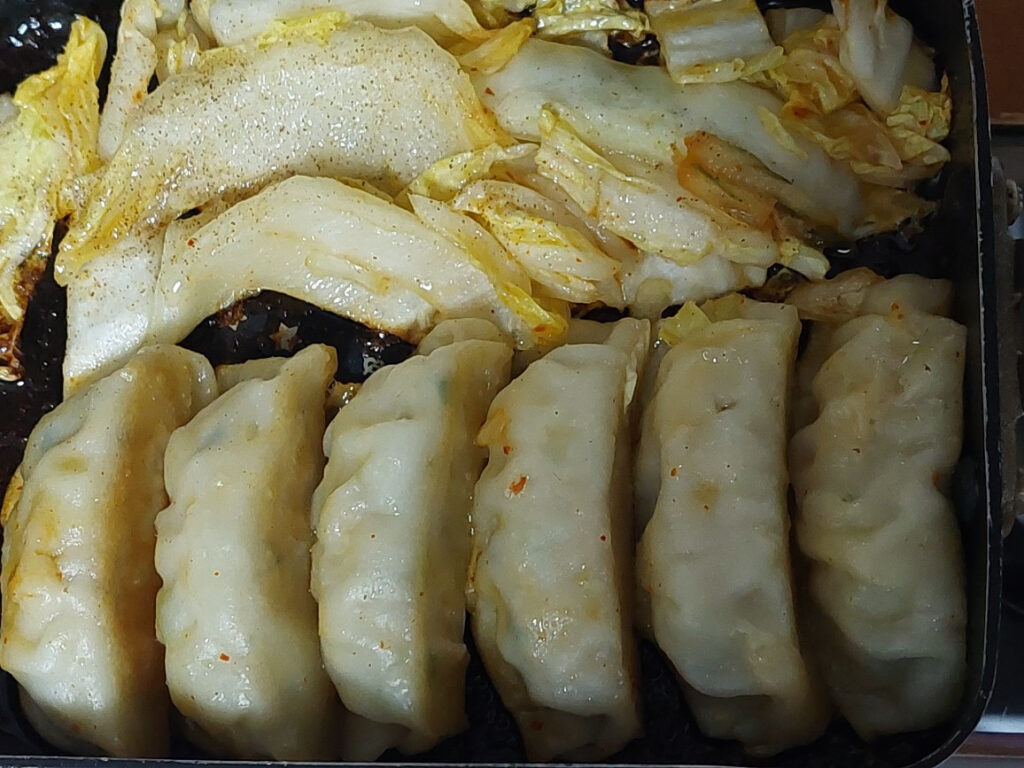 ブログとFacebookを更新してたらお腹が減ったので、餃子!!!冷凍庫に入れてあった、トップバリューの冷凍餃子を出して、小さな、フライパンで焼きます。冷凍餃子では、自分の中では、値段が安くて美味しいのトップバリューの冷凍餃子がコスパ抜群だと思います。基本、油は引きませんが、餃子だけでは、寂しいので、餃子の横に、白菜を大きめに切って、並べました。軽く、白菜に塩コショウをかけて、香り付けで、ゴマ油をかけて・・・