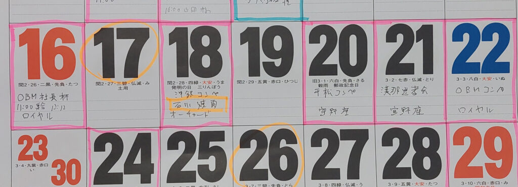 来週は週5???ラウンド???ゴルフがちょっと多くなっちゃいました!日曜日は、自分のスケジュールでは週末も・・・パソコンデスクの前のカレンダーは日曜日、来週の16日の日曜日が始まりです。OBM社長杯が16日、先月繰り上がりで優勝した沖銀コンペが18日、漢那区のコンペが20日、宜野座村のゴルフ大会の漢那区の選考会が21日、OBMの月例コンペが22日と週5回ラウンド。