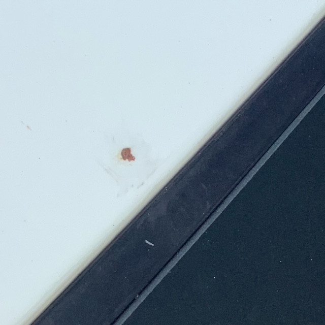 タッチペイントは、クルマの中じゃないところに保管したいと・・・前に、自宅前で自分で洗車すると、飛び石で結構、ポツポツ小さなハゲが・・・ボンネットはコーティングした効果かまだ、サビてませんでしたが、天井の手前に上の飛び石の後が2.3ミリですが、サビが浮いてるので、サビを落として、タッチペンでと思って、ダッシュボードのカルサイトホワイトのタッチペンを出して、塗ろうとすると。