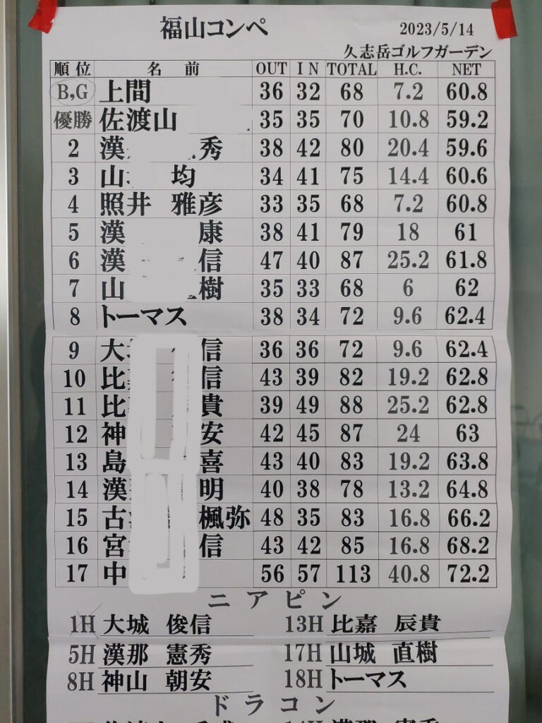 久志岳のゴルフコンペに行って来ました!トップスタートです、相変わらず持ってます?自分と同組の佐渡山さんが優勝です!パチパチ!年間に自分とラウンドして、優勝する人、上位入賞する人、ベスグロを更新する人が多いです!自分は68で同点で年齢上位でベスグロを取れず、トップスタートでショートに、自分がニアピンの旗を4つたてたものの、すべて抜かれて、一個も取れず、ハマらず4位でした。