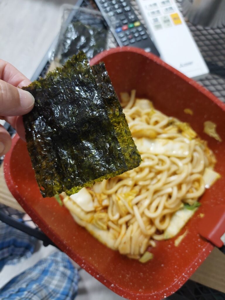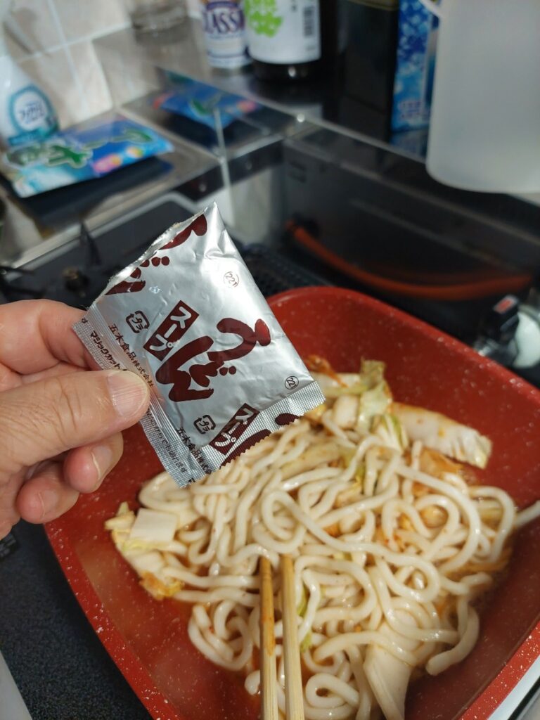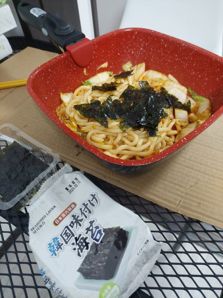 ニアピン賞でゲットした、うどんで朝食です! 2023/07/18 グルメ/料理 老人会のゴルフに参加して、ニアピン賞を頂きました、いつも使っている部屋干し用洗剤のアリエールの他に、ティッシュペーパー、うどん、レトルトの麻婆豆腐を頂きました。取り合えず、うどんで料理開始、焼うどんにします、キムチと炒めて隠し味?ついているスープの素を炒めている、うどんに少々振りかけて、後は韓国海苔を刻んで乗っけて完成!時短メニューですがとても美味しく出来ました。