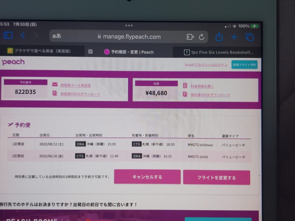 新たに、取り直すとこんなに高かった?ってぐらい、値段になってます!朝一で問い合わせダイヤルに電話して、つなぎっぱなしで約30分待って・・・。やっとつながって「飛行機を予約したんですけど???予約番後を忘れて確認したいですけど・・・(予約してないかもしれないのに・・・)」と出発日と名前を言ってドキドキしながら、調べてもらいました。もし、予約されてなかったら、速攻で北海道の往復チケットを取らなくては!結果は予約されてました!!!良かった!!!なんで、スケジュールに書き忘れただけでした・・・びっくりした!