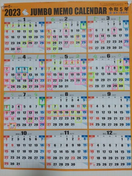 デスク前に、貼った年間の予定表もかなり埋まってきました。ゴルフのラウンドを数えてみると、本コース39回、ミニコース8回です。ちなみに、ベストスコアーが81でワーストが111、なんと100オーバーが10回、80台が10回でした。100オーバーは、シャンクが多発した他に、宜野座の代表選考会や大会などでフルバックティーと、難しくてOBが多発するエナジックが多いです。