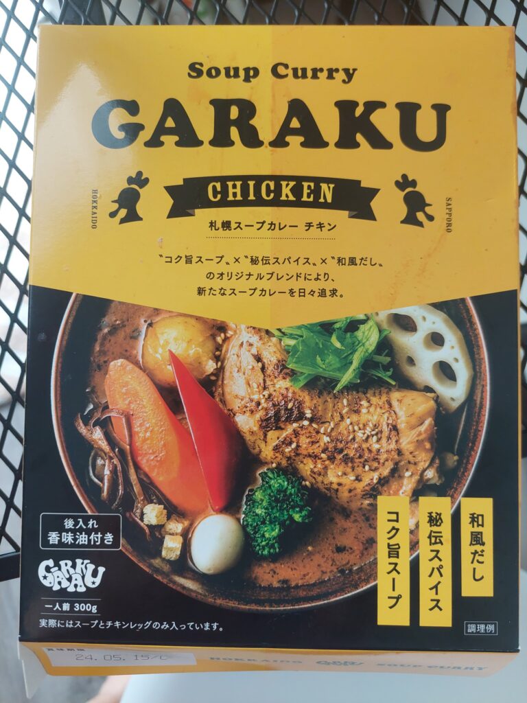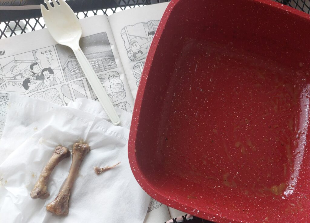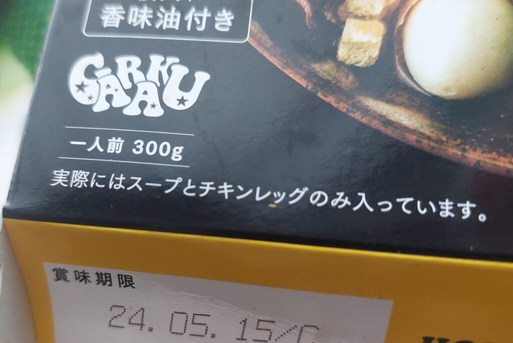 PS.完食後、あらためて、老眼鏡をかけてパッケージを見ると、箱のしたの方に、小さく「実際にはスープとチキンレッグのみ入ってます」書いてありました。が!得意のマシマシ攻撃で、暗い室内で停電中でも、最高に美味しい、朝食でした。残ったのレッグの骨のみ!超ー美味しいラーメンの全ツユ状態でした。