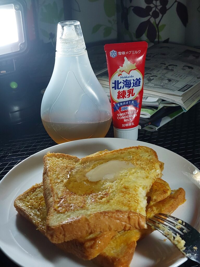 ガッツリ食べたので、お腹は減ってませんが・・・もう牛乳も食パンも傷みそうなので、真っ暗なコンロの前をランタンで照らしてフレンチトーストを作りました。超ー甘党なので、フレンチトーストに、ハチミツとコンデンスミルクをかけて食べました完全にカロリーオーバーですが・・・今思えば、パリパリアイスバーを4ケース買ってきて、すぐに食べちゃったけど停電の前の日に食べきったので、結局、溶ける前で良かったんだよな???