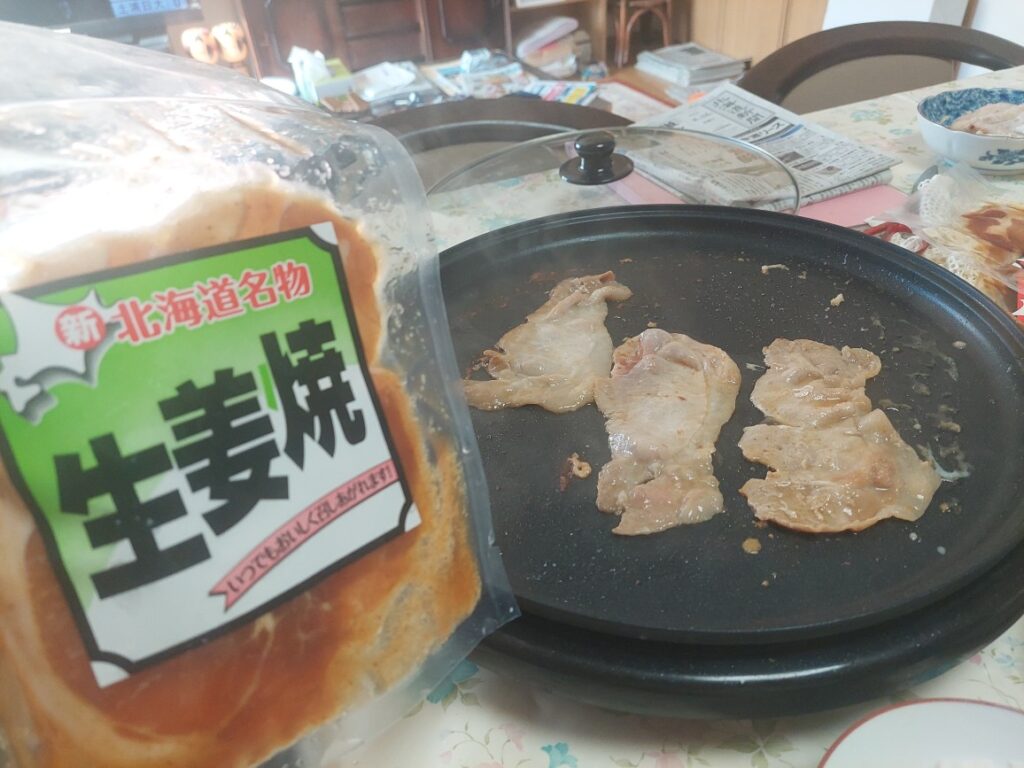 ゴルフ自給自足?(ゴルフの賞品でご飯を食べる)17日に、弟がゲットした、豚丼とショウガ焼をホットプレートで焼いて食べました。ママは一人ぐらいなのに、冷蔵庫には一杯、本人も何が入ってるかわからないくらいです、で肝心なものは入ってません。豚丼なんですが、大昔、帯広で初めて食べた時、ご飯の上に味がついた豚肉がのってるだけで、野菜がありません、なんで?バランス悪いと思いました、途中で慣れましたが・・・。