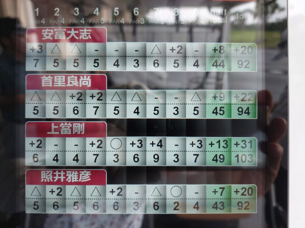ロッカーにボストンバック置いて、外に出ると、雨が降ってます???えーさっきまで青空だったのに・・・。ダイ選手が居て「照さん、カタブイ(沖縄の方言で通り雨で、片方だけ降ってること)カタブイ!」で、奥には青空も見えるので、スタート、一瞬、小降りになりますが、スコールみたいな激しい雨で、シャツだけじゃなく、スラックスパンツの中パンツ、買ったばかり?ゴルフシューズで防水性能は高いはずなのに、上の紐の部分から雨水が入るのでぐっちゃぐちゃ。こんなに、大雨なら、朝のゴルフでやめて、おとなしく帰って、寝てれば良かった・・・?
