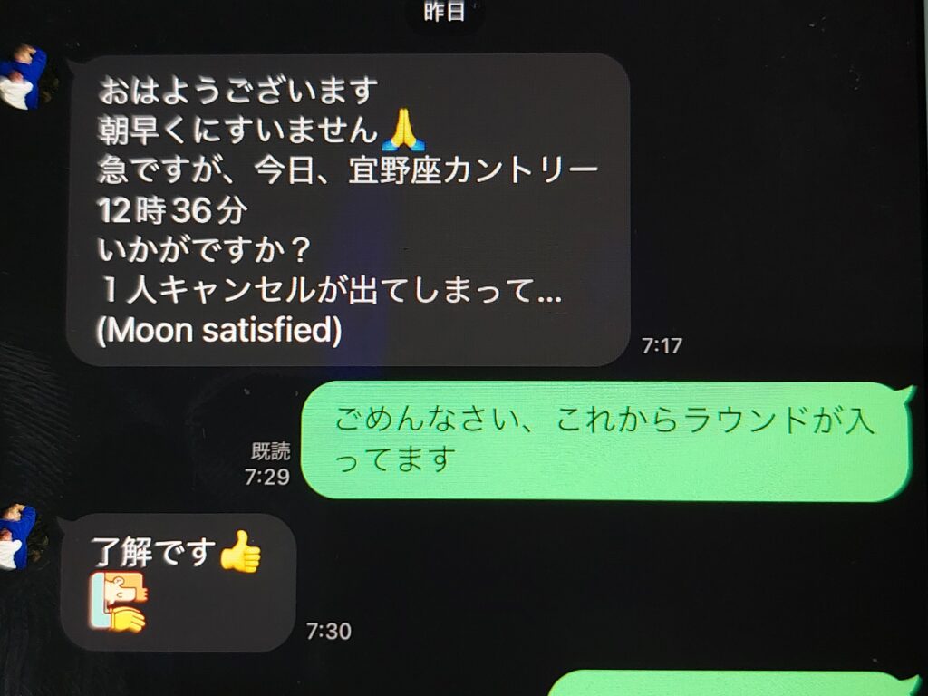 ラウンド後、ブランチをとりながら、またラウンドしましょうねと・・・解散!ここからが、ゴルフフリムン全開です。朝一、いつも突然?お誘いがくるダイ選手から、ラインが・・・一人来られなくなったので、ゴルフしませんか?で・・・自分は今日ラウンドがあるので、一回断ったものの、時間的に高速でとばせばと間に合うと思って電話して「もう埋まった?」と聞くと「3人だと割りましかかるので・・・」で「じゃあ向かうね・・・!」コースに行く前に、家に寄ってラウンド後にお風呂に入るのに着替えを取って。
