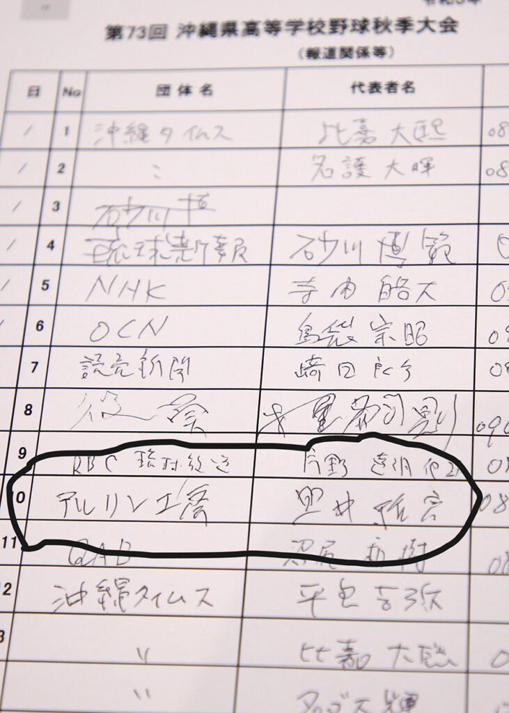 家に帰って、すぐに、カメラを持ってすぐ名護のタピックスタジアムに向かいました、当然、駐車場は一杯で、かなり遠くにやっと停めました。そこから、1キロ近く、炎天下の中、撮影機材を持って、球場に向かって、取材受付で受付をして、入れました!名護球場は何回も入ってますが、タピックスタジアムは初めてです。大手新聞社やテレビ局に交じって、テルリン工房はちょっと恥ずかしい?