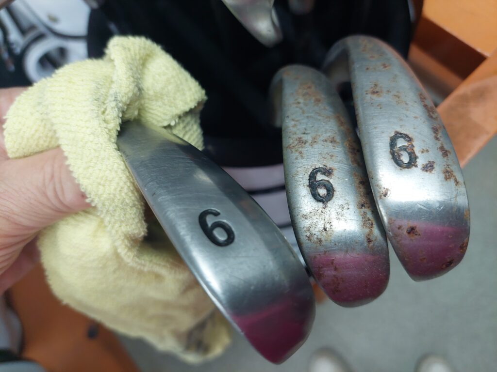 昨日は、とても充実してました、一昨日に、クラブを各番手ごと、ドライバー、ウッド、UT、アイアンも各番手に分類。シャフトやヘッドがサビをだらけに、なったクラブものを、自分がテルリン工房から持ってきた、サビび取りのスプレーを、ヘッド、シャフトに吹き付け、サビを金ブラシやサンドペーパーで落としながらのメンテンナンス、自分の本来業務に近い仕事を始めました。