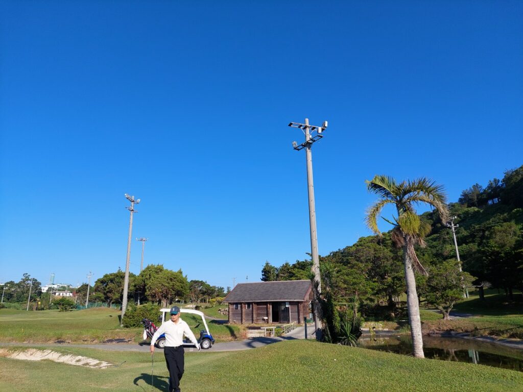 最高の天気の中、以前の仕事先のゴルフ好きと仲間と具志川ゴルフクラブに行って来ました!最高の天気の中一人は元同じセクションで一緒に仕事をしていた金城さん、今は自分と同じくOIST(沖縄科学技術大学院大学)を退職してますが、ゴルフ好きで前に某有名店でリシャフト交換を断られたボロンシャフト交換とグリップの交換をした友達でお客様です。体は小柄ですが、パンチの効いドローショットで飛ばします。(自分は飛ばないので羨ましい)