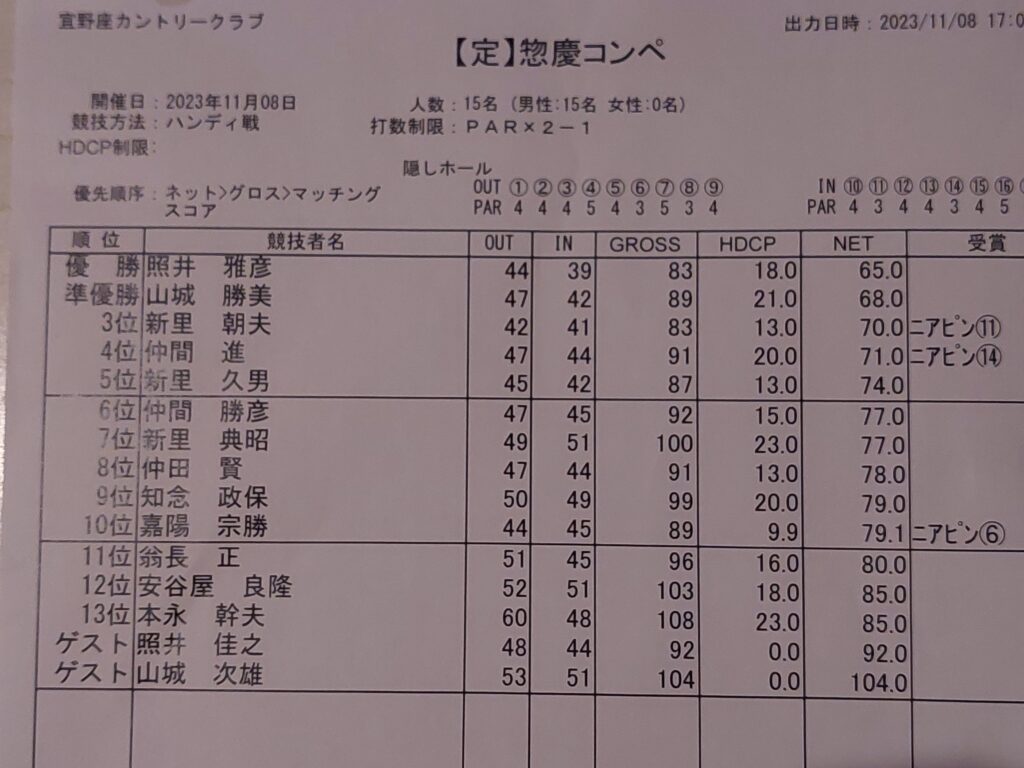 ラウンドを終えて、風呂に入って、弟に買ってきてもらった、山形の美味しいお酒、出羽桜の大吟醸持って、反省会&表彰式に行って来ました、同組の日本酒好きの健さんと自分と弟ともう一人ぐらいしか飲みませんでしたが、美味しいので、あっと言う間、一升瓶が無くなりました。で順位は、ベスグロで優勝しました。遅ればせながら、今季7勝目です。パチパチ!