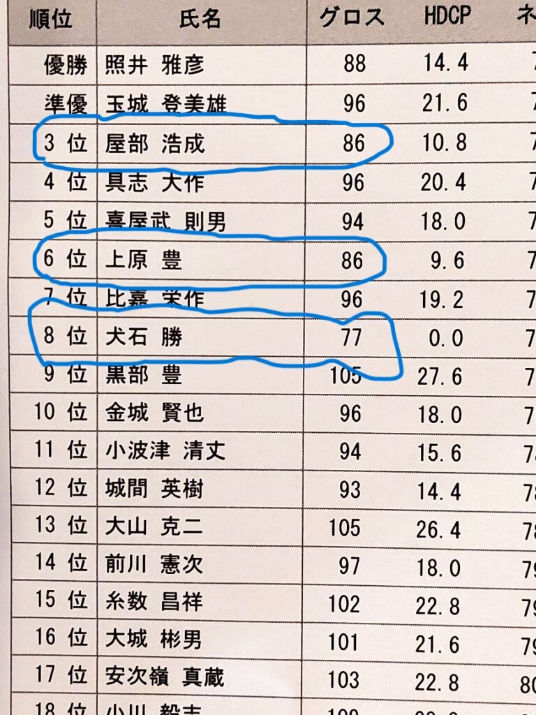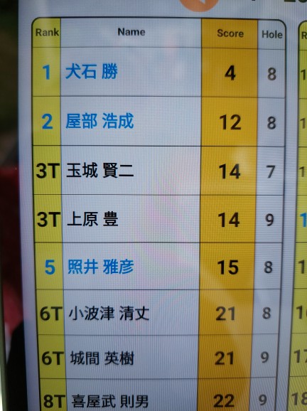 PS.今回はライバルの上原さんと同組では無いので、お互いに不調も、カートに表示されている順位表で確認しながらラウンド、一進一退の攻防もまた自分があがりに2ホールでパーを取れず前回と同じ2打負けでした。ぺリアで前回優勝の上原さんは6位、同組の屋部さんが3位、ベスグロの犬石さんが8位でした。