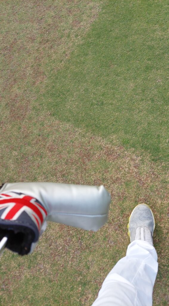 スタートホールに着いて、前に5組もいるので、パター練習してからでも、十分に間に合いましたが、戻るのも面倒なのでそのままスタート。1番ホールはロングホールパーオンしたものの、長めの登りのパットが残りました。エアーレーションの穴を埋めた名残りの、砂が一杯ありますし、本来のグリーンの芝では無い芝が生えていてボコボコです。