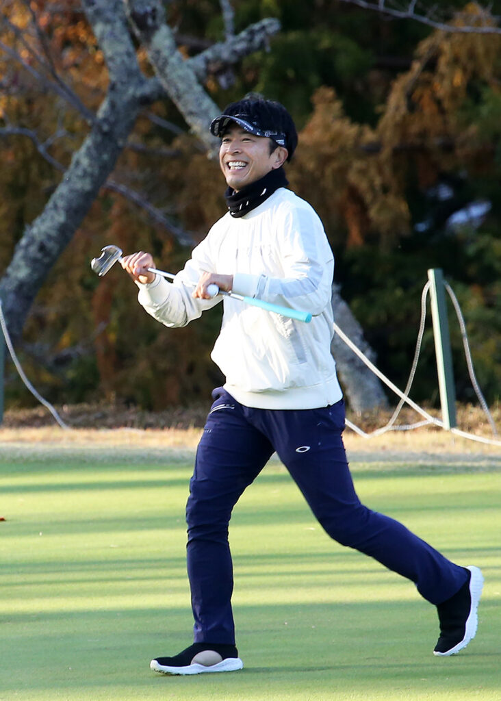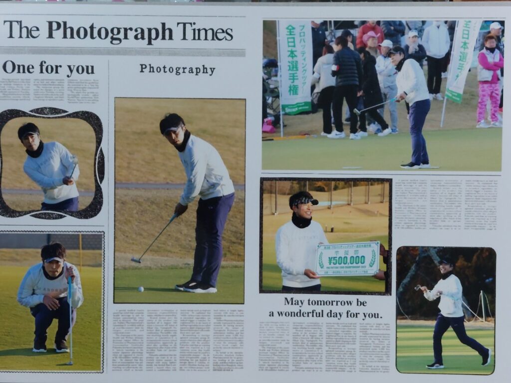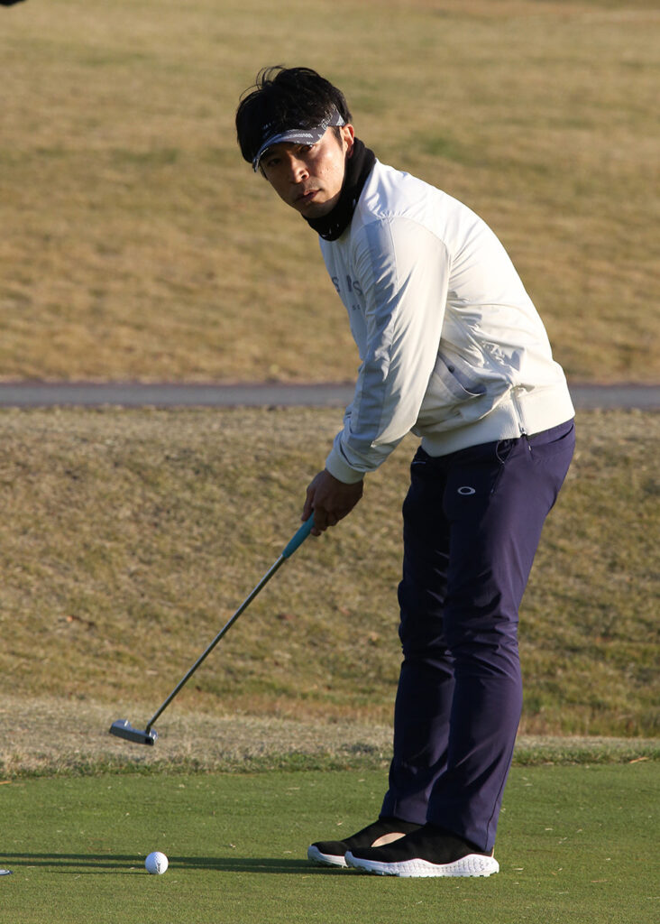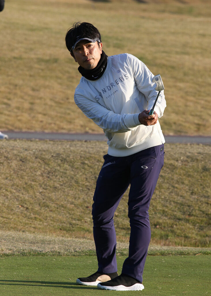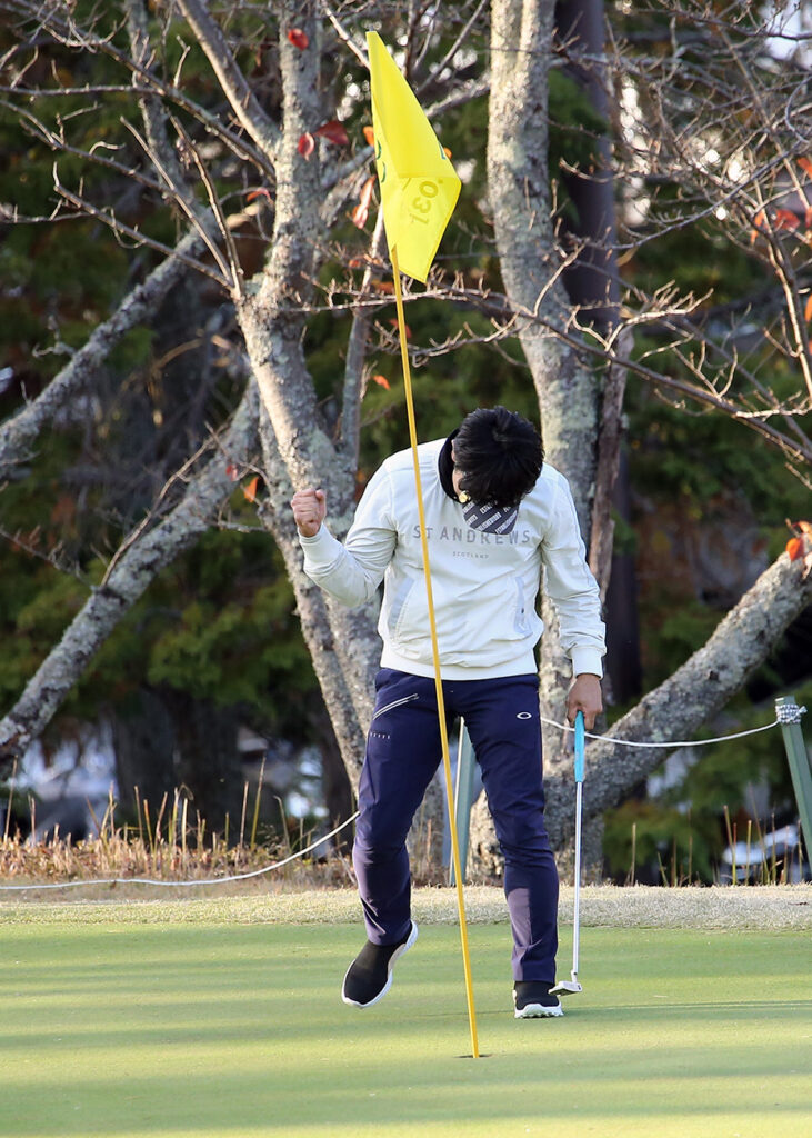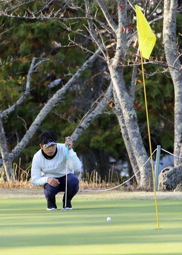 決勝ラウンドでの最終ホールは、お見事でした今年の大会で間違いなく、最大距離の88ヤードのパー2。自分は、88ヤードの中間地点で400ミリの望遠レンズで撮影、テーショット?のようなファーストパットでした。遥か先にあるカップに向かって、急激なスロープを数回下り、ボールは1メートル半ぐらいにつけ、それを沈めて見事なパーでした。写真を撮っていても絵になってました。