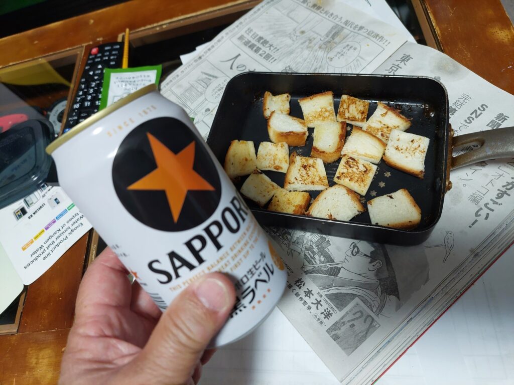 PS.夜はエリンギのバター炒めとランチョンミートを焼いて、ご飯のおかずに。いつも、油が大量に、フライパンに残って、キッチンペーパーで拭きとってますが?食パンを切って焼いてみました、貧乏レシピだけど・・・これがとても美味し!バターと塩コショウ、エリンギ味?大正解!