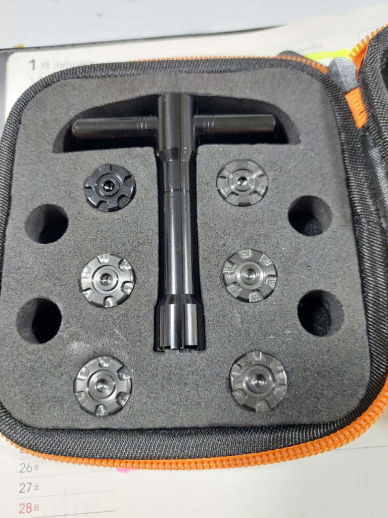 標準ウェート一個、ネットで注文するなら、専用レンチ付の6個セットを購入しました、で色々調整できると・・・。札幌から帰ってくると、彼が格安で左用のドライバー見つけてて、残念ながら、無駄になってしましたが。まあ、ソコソコ使える、左用のドライバー出来たので、今度レンジで打ってみようかな?