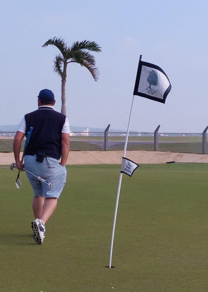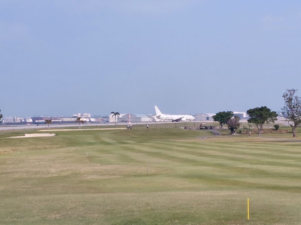 基地の中はグリーンのメンテナンス良く、他の沖縄コースに比べて全然速いです。出だし、速いグリーンに苦戦してましたが、途中からタッチも合い、前半はドライバーとパットでしのいで、なんとか、ボギーペースの45。後半、名物10番ロングでボギーも・・・。11番で残り90ヤードから、シャンク病再発、すると、アプローチイップスもでて、後半はビックイニングだらけ。