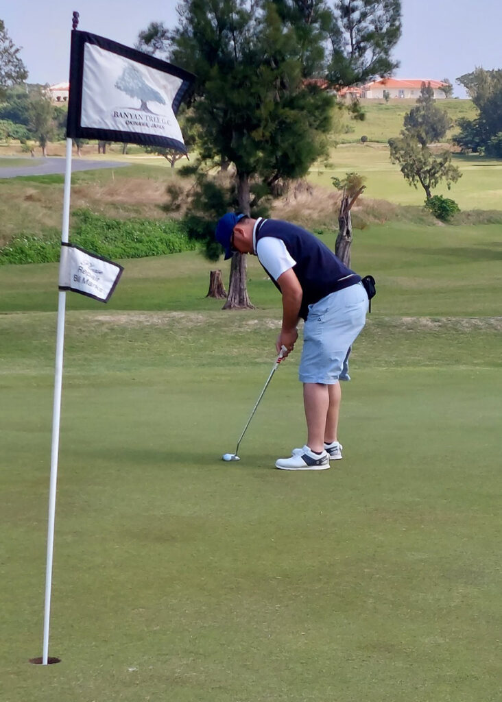 自分の2打目は残り170ヤード左からの風と傾斜で、グリーン右手前に落ちて行って、3打目を寄せきれず、2パットでボギー。自分と同じラインで入れれば、バーディー・ボギーで「キョダコド」が逆転も?外して2パットのパーで同点で終了しました。んーーーシャンクが出なければ・・・ぶっちぎりだったのに???