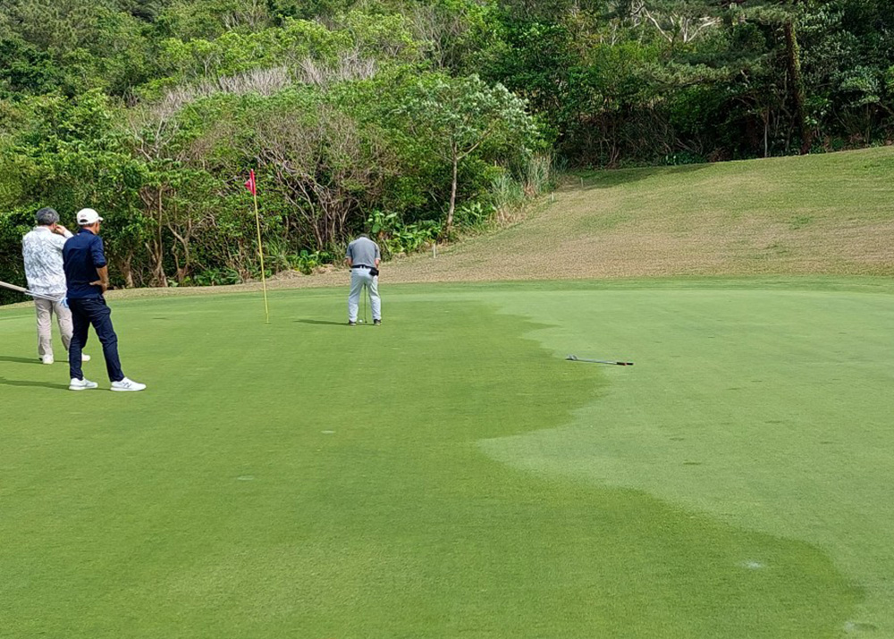 3打目が残り59ヤード、雰囲気を出すとシャンク病が出そうな嫌な距離なので、取り合えず3オン、段の上に付け、2パットでボギー。11番はドライバーは左の林の方向に行ったものの、グリーン方向が狙える170ヤードを2オン2パットでパー。7番まで、グリーンの芝目が複雑で、同じラインでも逆目と巡目で、3パットもありも2オーバー久しぶりに70台?