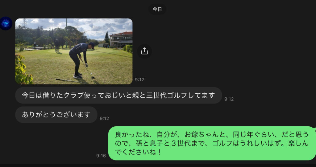 その同僚の、友達もゴルフを初めて、ゴルフ場の貸しクラブ熱心にやっているので、キャディーバックとドライバーからパターまで貸してあげました。で、自分にラインが来て、親子三世代でラウンドしたと・・・。
