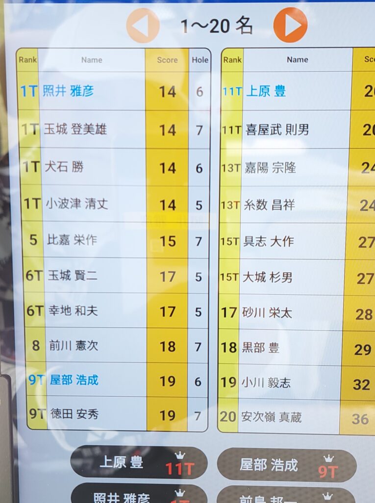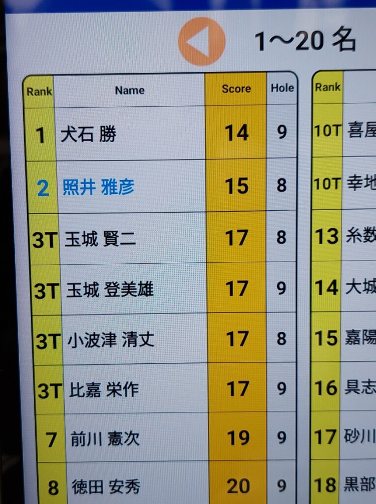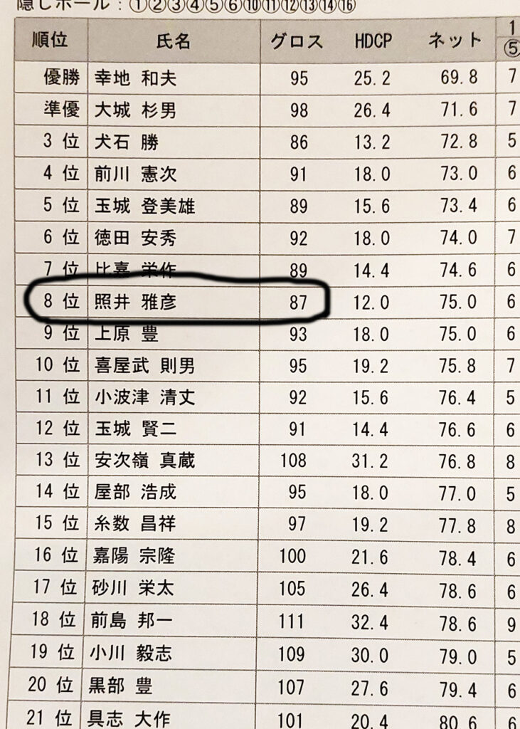 スコアーも後半持ち直したので、14番でグロスでトップタイで躍り出たものの、最終ホールでバーディーチャンスにパットを決めれなかったので、前の組の犬石さんが強風の最終ホールでバーディーを取ったので、ベスグロは一打差で取れずでした。ちなみに、ダブルペリア戦もハマらず8位でした。