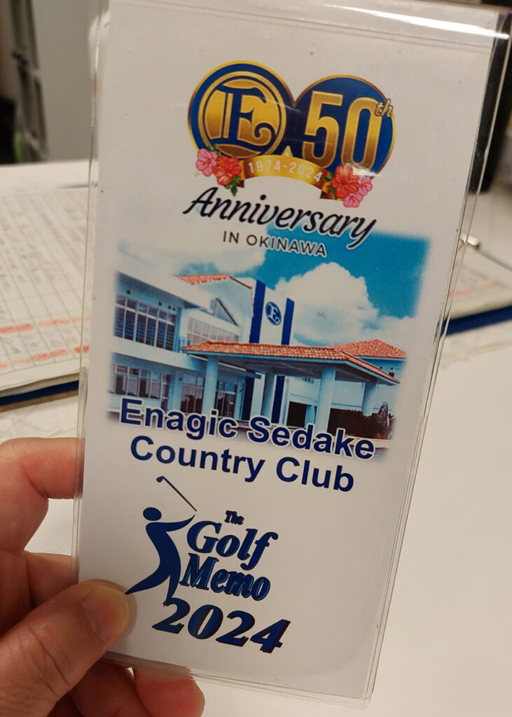 自分が居た時に入った小橋川君が、丁度フロントにいたので、最近の近況確認をして、瀬嵩カントリーは、ナビシステムも無いし、GPSのコース対応もしてないので、ヤーテージブックをが売ってたので購入しました。