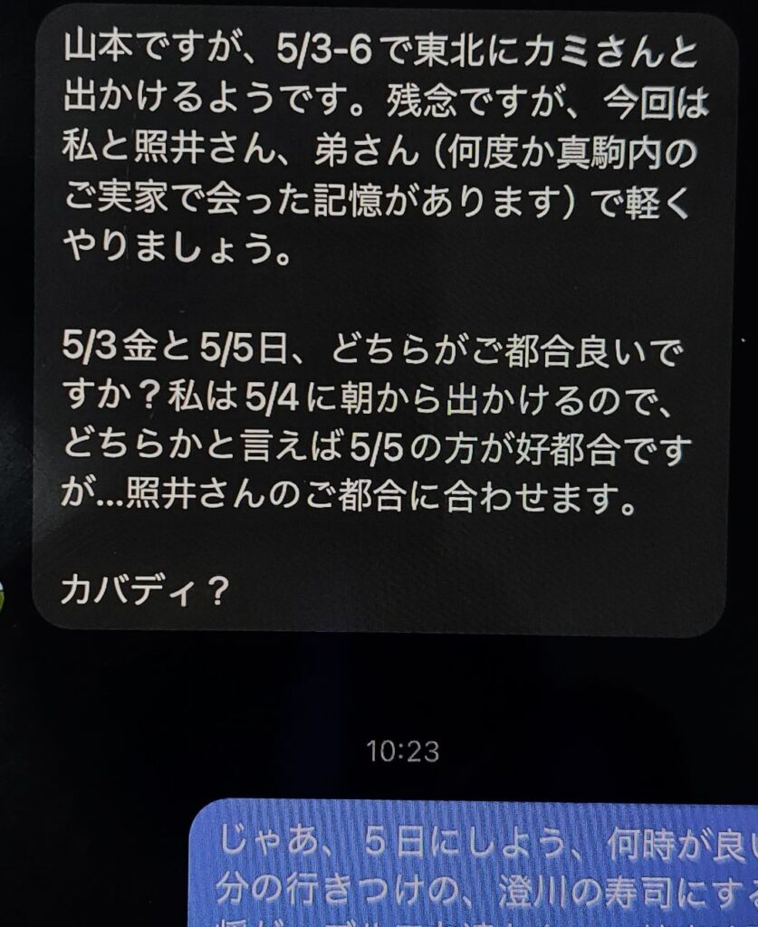 偶然、Facebookで大学時代の新聞社でバイトしていた後輩を発見!「元気か?俺わかる?」と、投稿したら、返事が来て、30数年ぶり?時間を調整して会う事になりました。実は今が夢の中で???自分の死期近い?もう寿命が迫っているのか???最近、昔の夢をよく見ます。元の会社の後輩に、無理を言って、昔の同僚を探してもらい、会社の元同僚にも数十年ぶりに会う予定です・・・でも、浦島太郎?自分がハゲて髪が無くなってるのにビックリされそうです・・・