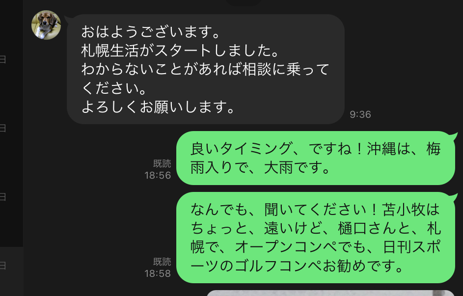 PS.自分のゴルフ友達の一人で、内地から沖縄に移住した、本郷さんから、ラインが来ました。夏?梅雨入りのシーズンだけ、北海道で住んでゴルフするみたいで。自分も北海道ですが、沖縄の良いゴルフシーズンと、これからは北海道がゴルフは最高のシーズンになるので、凄く幸せで、羨ましいゴルフライフだと思います!