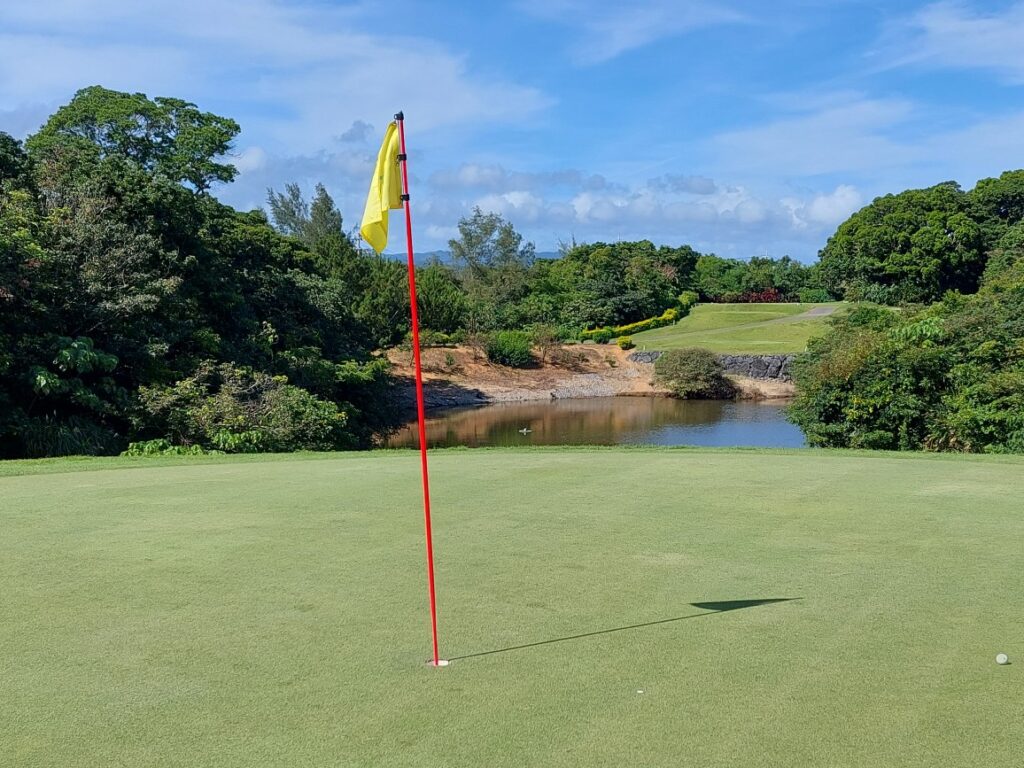 3連戦の初日のベルビーチ、打ち下ろしのミドルで今まで全く届かない位置まで、ボールが飛んでました。打ち下ろしプラス、ドローボールなので、250ヤード近く飛んで、グリーン手前30ヤードくらいの行きました。アプローチで2メートル以内につけるものの、パットがこの日は今一でバーディーならず。