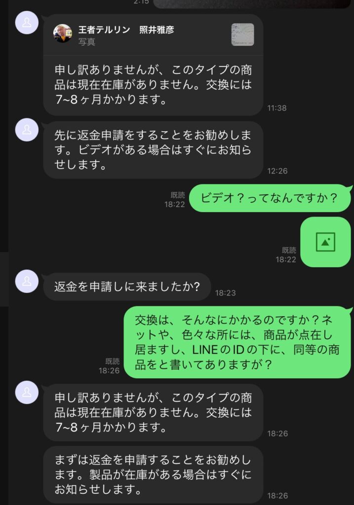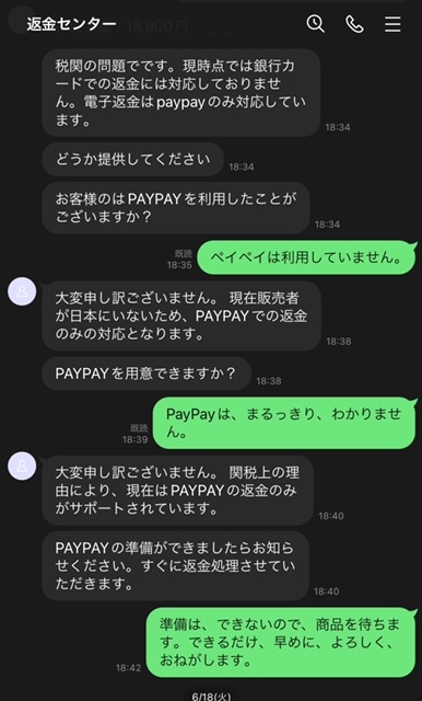 で、返金センターに連絡すると、同じ商品は一時的に????欠品でと書いてあるので、自分は「同じ商品をお願いします!」と返信したら、商品は7.8カ月かかるので、返金をお勧めしますとの事???で返金を申請したら、こちらには、カードでなくて、現金で振り込みって言ったのに。PAYPAYしか、対応してないと。自分はPAYPAYは使ってないし、商品を待ちますと送った時点で音信不通に。当然、振り込んだ先のメールも音信不通。