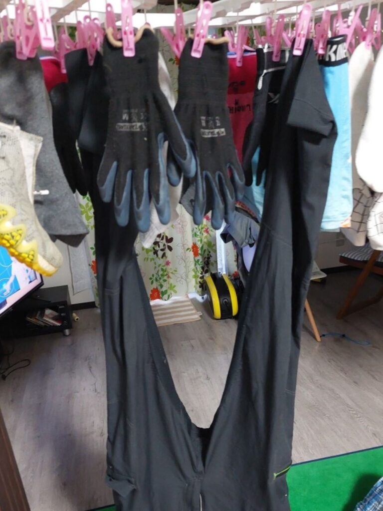 まず、長靴の中もぐしょぐしょなので、中敷きも洗濯、靴の中も、かなり濡れて湿っているので、泥だらけの靴を風呂場で洗って、乾燥機をだして、乾かします!着ている物のも、ビショビショなった下着類を洗濯機に放り込んで、泥だらけビショビショ空調服の空調機を外して、スラックスと一緒にふろ場で、泥を落としてから洗濯。
