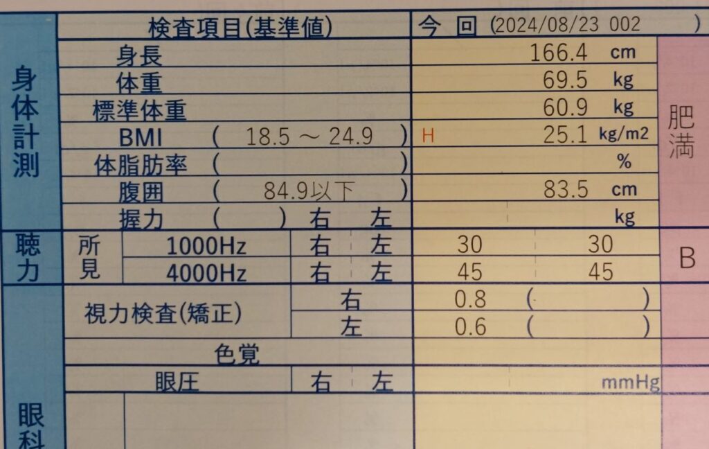 健康診断の結果が来ました、またまた、大学の成績?と同じく?AもBもCでもなく、D判定でした。ちなみに身長を測る機械がオートだったので、背をしっかり伸ばす前に測定されちゃって、身長がかなり少なく?166.4センチと測定され、服を着た状態での体重測定は69.5キロだったので、BMIが標準地の上限24.9㎏/m2をわずか越えて、25.1㎏/m2て肥満判定になっちゃいました。