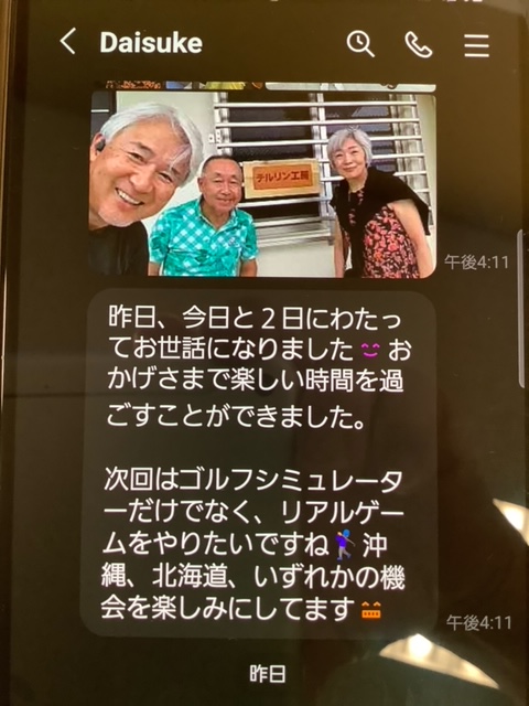 食事後、当初は知花ゴルフも考えてましたが・・・天気が微妙だったので、家に遊びに来てもらいました!ゴルフは出来ないけど、テルリン工房にゴルフシュミレーターがあるので、パターの方のシュミレーターを3人でやりました。