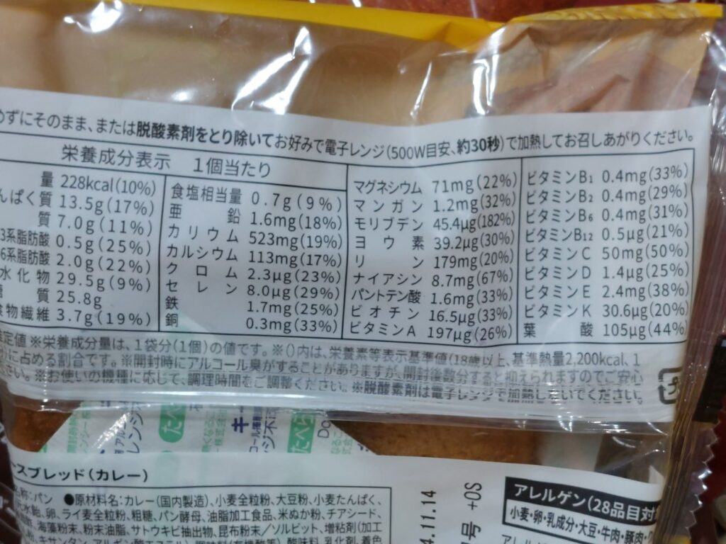 早速、パン好きの自分が食べると、粉っぽくてボソボソで食感も悪く、全然美味しくないぞー!プンプン!宣伝では、美味しいパンを食べて、一日分の栄養を取りながら気軽に、置き換えダイエットらいいけど・・・。パンのパッケージの後ろに記載されている、成分表をみると、確かに栄養分はありそうだけど・・・