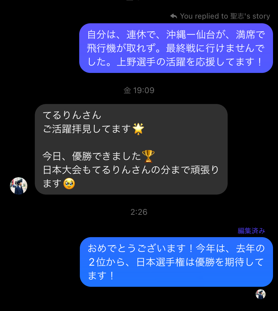 上野聖志プロのインスタに、仙台に行って来ますと、載っていたので自分は、飛行機が無くて、行けませんと、活躍期待してますと、ちゃんと優勝してました流石です!