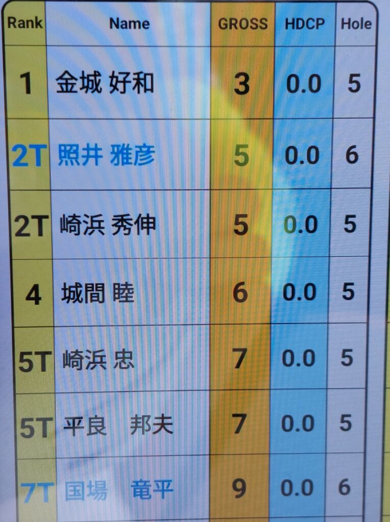 そこで、ピン狙い方向では、枝に触れないように、グリーン左を狙って、スライスで行けば良かったのに・・・。7番アイアンのフェースをかぶせて、弾道を低く出そうと、打つとシャンクが出てOB、打ち直しで打つとやっぱり木の先の枝に当たって右へ・・・30ヤードを寄せて1パットでダボでそれでも、5オーバーのグロスで2位です!