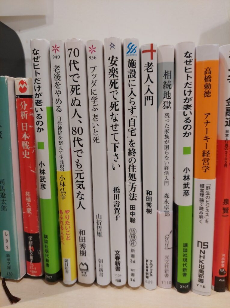 デスクの正面には前に、本が色々並んでおり、前にブログで紹介した「田舎暮らし読✕毒本」などが、並んでますが・・・・。当然?警備の仕事は年配の方が多いのか?テルリンには無縁?とも思われる、本がずらりと並んでます・・・「70代で死ぬ人、80代でも元気な人」「安楽死で死なせてください」「なぜヒトだけが老いるのか」「老人入門」「老後をやめる」「施設に入らず「自宅」を終の住処にする方法」などなど・・・もう、テルリンも?実は老人なのか???
