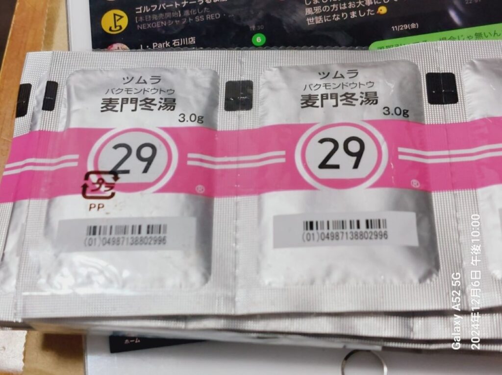 また?糖尿病が悪化したと思い、内科に行ってみると「眼科に行ってください」と、熱は治まったけど「咳と鼻水、喉の痛みが酷くて、市販薬は飲んでるけど全然効かない!」と言うと、それに効く???薬を処方してくれましたが・・・その薬も、全然効かず、咳が止まらなくて、まともに睡眠も取れません。大井田君も咳が止まらずだったので、もしかしてうつった?ラインしてみると「ツムラ29番」良いらしい見たいなので、テルリン薬局?にもツムラは常備してあったので飲んでみます!