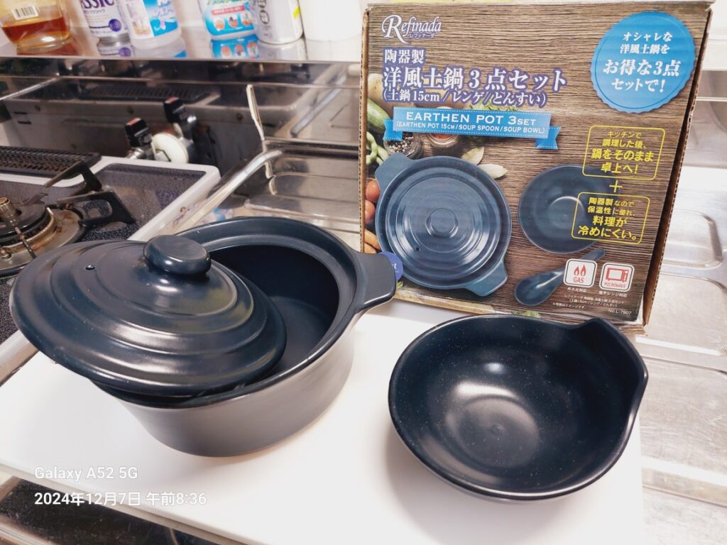 冷蔵庫は、空っぽだけど、台所の上の戸棚には、カップラーメン、袋麺、鯖缶、ランチョンミート、レトルトカレー、レトルト中華、色々ありそうなので、一回すべて出してみました。結構、あるぞー?なんだ?これ?青い包み?多分コンペの賞品!!!開けて見ると、オシャレなネイビーの小さな土鍋、これからの、沖縄でも寒い季節、一人鍋、雑炊、色々活躍しそうです!まず、賞味期限が早いものから食べて行こうと思います!