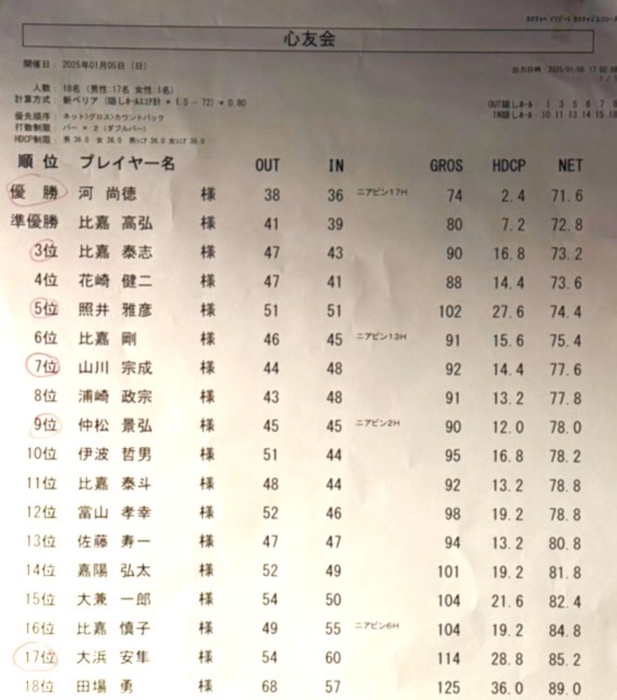 反省会&表彰式には参加できなかったけど、自分は、意外とハンデがついて5位でした。河さん凄いな!あの難しいピンポジでバックティーから2オーバーの74は、大パチパチです!でも、この会は、いつも思うけどレベル高いな、まだ若い比嘉ブラザーズも、実力的には楽々80台前半か70台でまわる力はあります。そういう、伸び盛りの若い子と回るのは、デージー楽しいですし、次回は体調を万全でチャレンジしたいと思います!