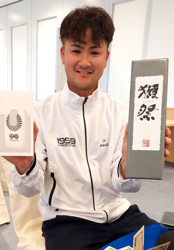 | 5位・比嘉ブラザーズの兄の泰志くんが、純米吟醸酒と簡易クーラー |