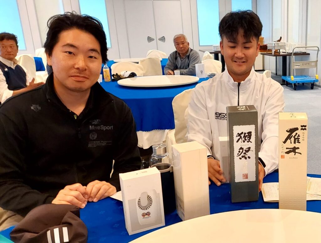 ゴルフの方は、難しいグリーンに翻弄され、難しいコースにも打ちのめされながらも・・・絶好のゴルフ日和なか楽しくラウンド出来ました。当然ながら、チームテルリンも絶好調で、良い賞品はほぼ?うちらでゲットしました。上位から、好きな賞品を選べるのでシステムです!ちなみに、山ちゃんさんが狙っていた、純米大吟醸酒と純米吟醸酒は全てチームテルリンの別の3人が独占!