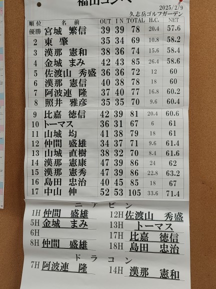 PS.次のゴルフの予定は、来週の13日、漢那区の老人会でまた久志岳の予定です、次回は親父ギャグの、タレントが一杯でないように頑張りたいです!もう、2月も中旬、15日の給料がでたら、今度こそ、左用のゴルフクラブのアイアンセット買わなくちゃ!もう3月になるし・・・予定では本コースデビューなので・・・