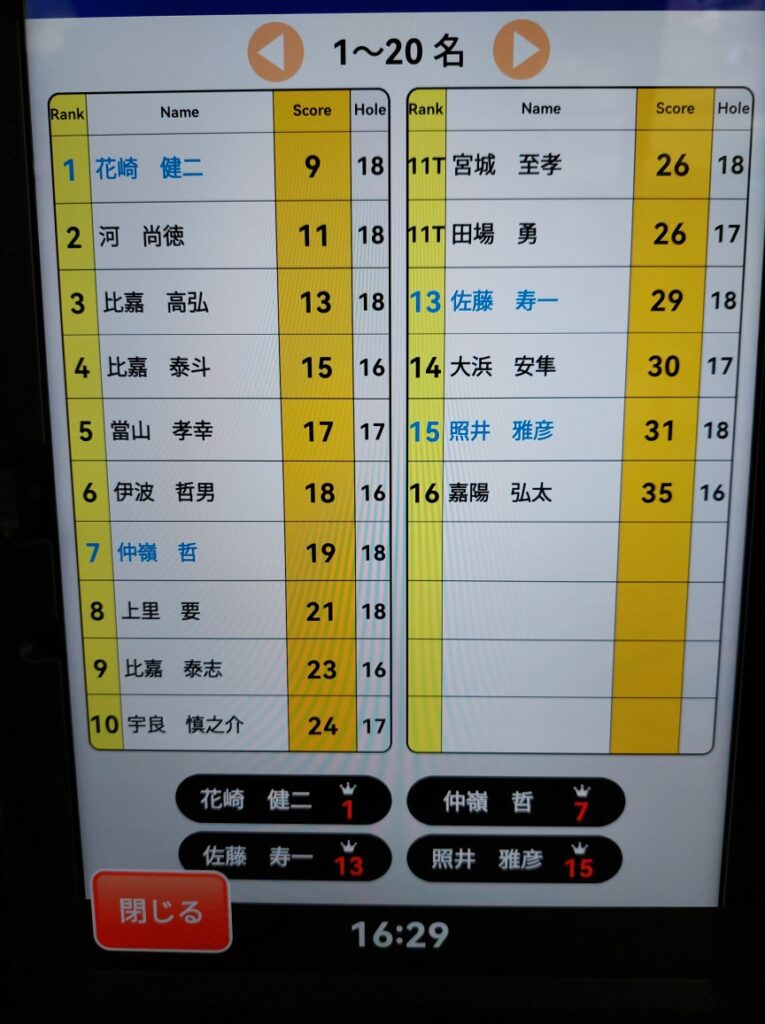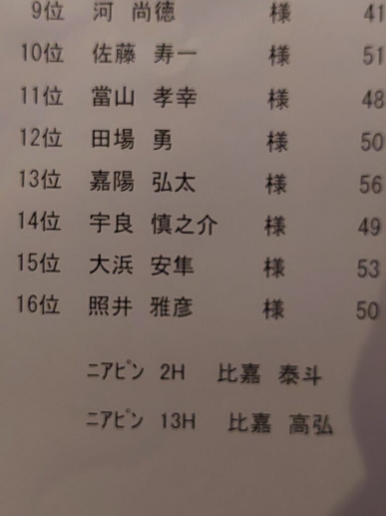 前半、6番と8番の2つで9オーバー50でターンも、ダメだったのはこの2カ所で、ハンデの隠しホールハマれば3戦連続の優勝も・・・と思いましたが、前半の8番でシャンクが出てからは、いつも通り後半はアイアンショットやアプローチがボロボロの53でトータル103はハンデもハマらず最下位でした。