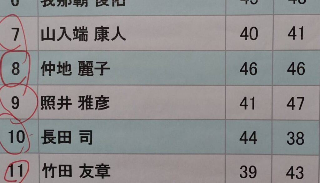 10位なら、飛び賞、8位なら優勝より嬉しい当日賞でした・・・ガックシ・・・ちなみに77歳の山入端さんは40-41の81の高スコアーで7位で当日賞とテルリンと同じく順位が1つ違いでした・・・残念!でも、テルリンは、このレベルの高いコンペで2つニアピンを取りました!これは自分に大パチパチです!