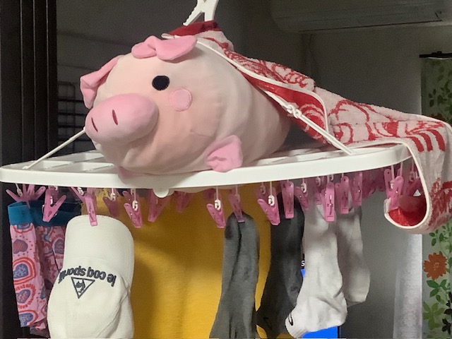ピンブー(ピンクのブタの抱き枕)をお風呂に入れました。明日はシロプー(白のブタの抱き枕)