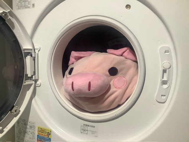 結構?大き目の洗濯機ですが・・・1匹1匹が大きので、1匹づつで、今回はピンクのブタのピンブーです。お風呂(洗濯)の後、乾燥機で乾かして、その後に陰干しで終了です。